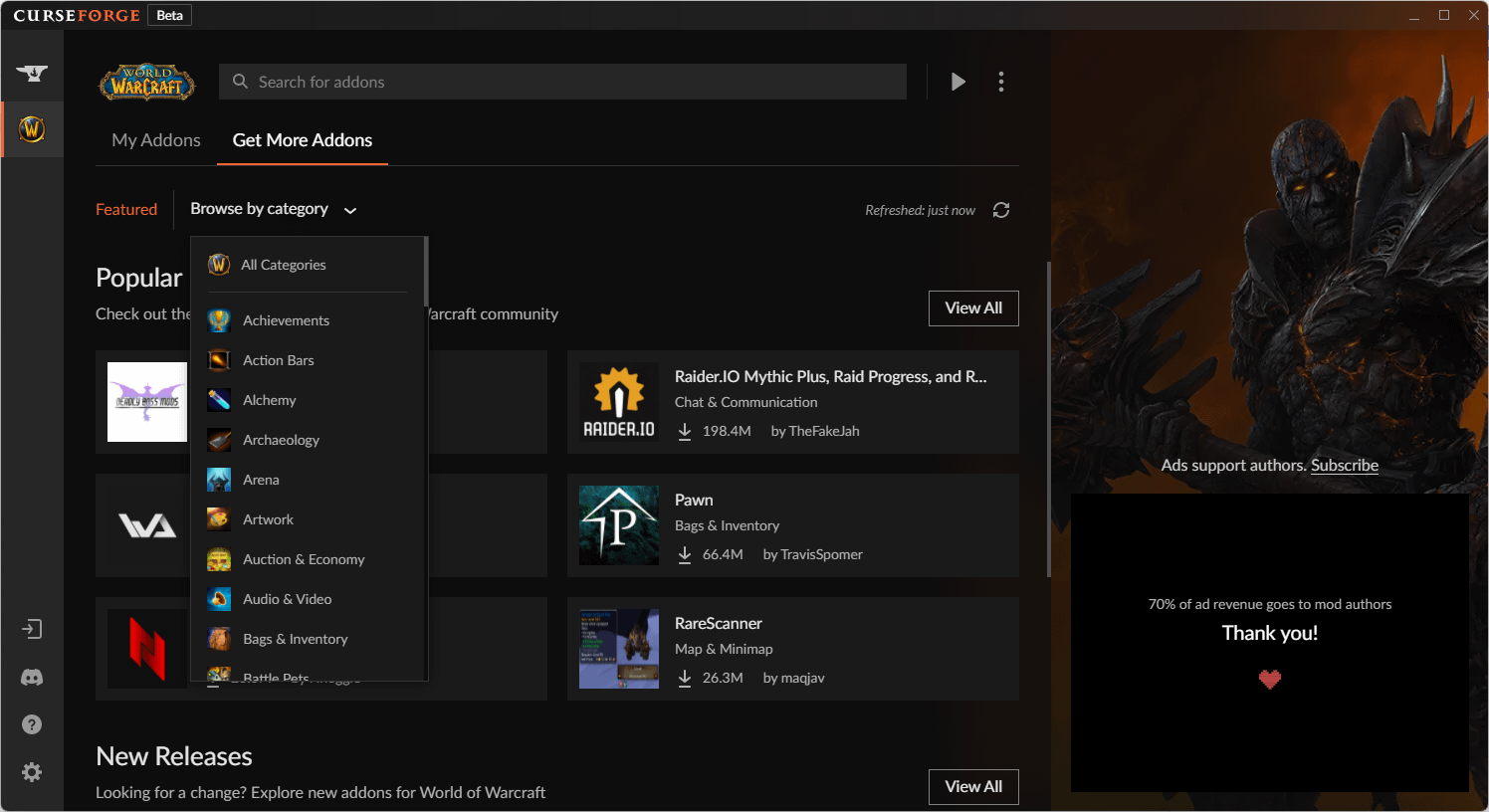 Finding modifications is pretty easy — the Curseforge client has everything you need. They are sorted by type and use to be more convenient. The application will find the installed WoW version, then you just need to click on the «Download» button, and then restart the game or type /reload in chat.