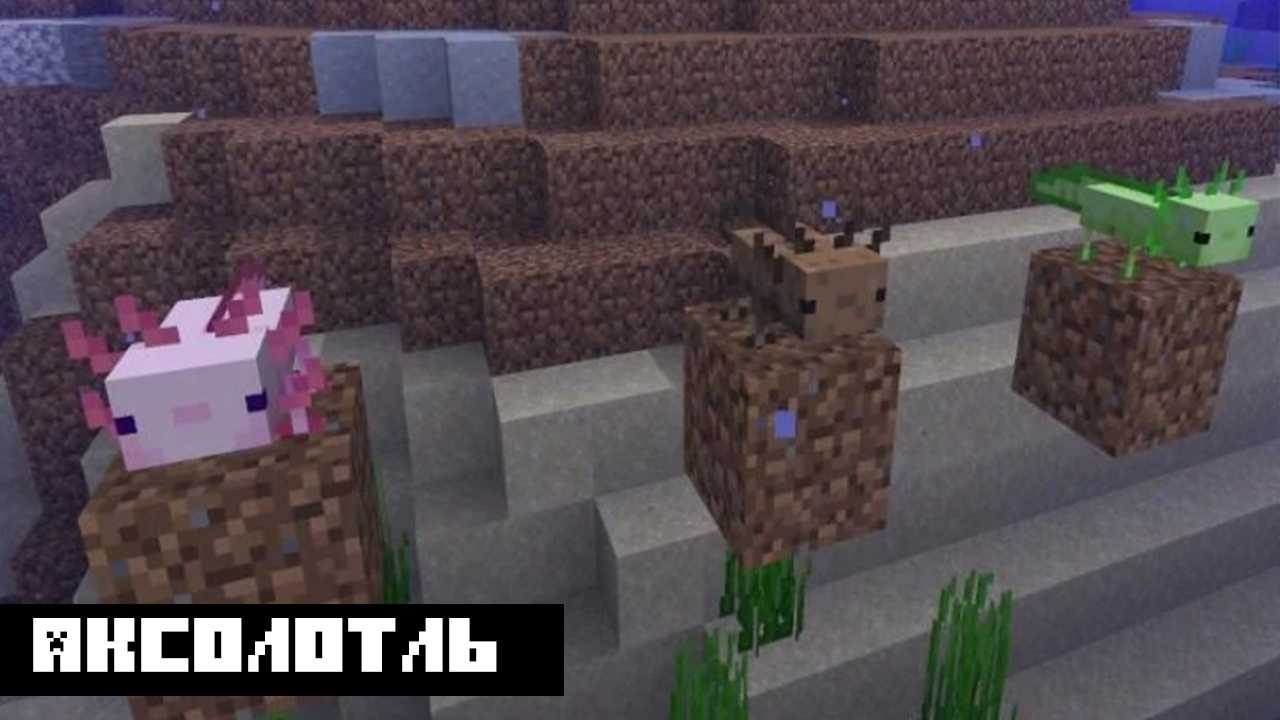 Новые мобы аксолотли пещерного обновления Майнкрафт 1.17 на ПК, которые невероятно красивые и с которыми можно подружиться, покормив их тропической рыбой.