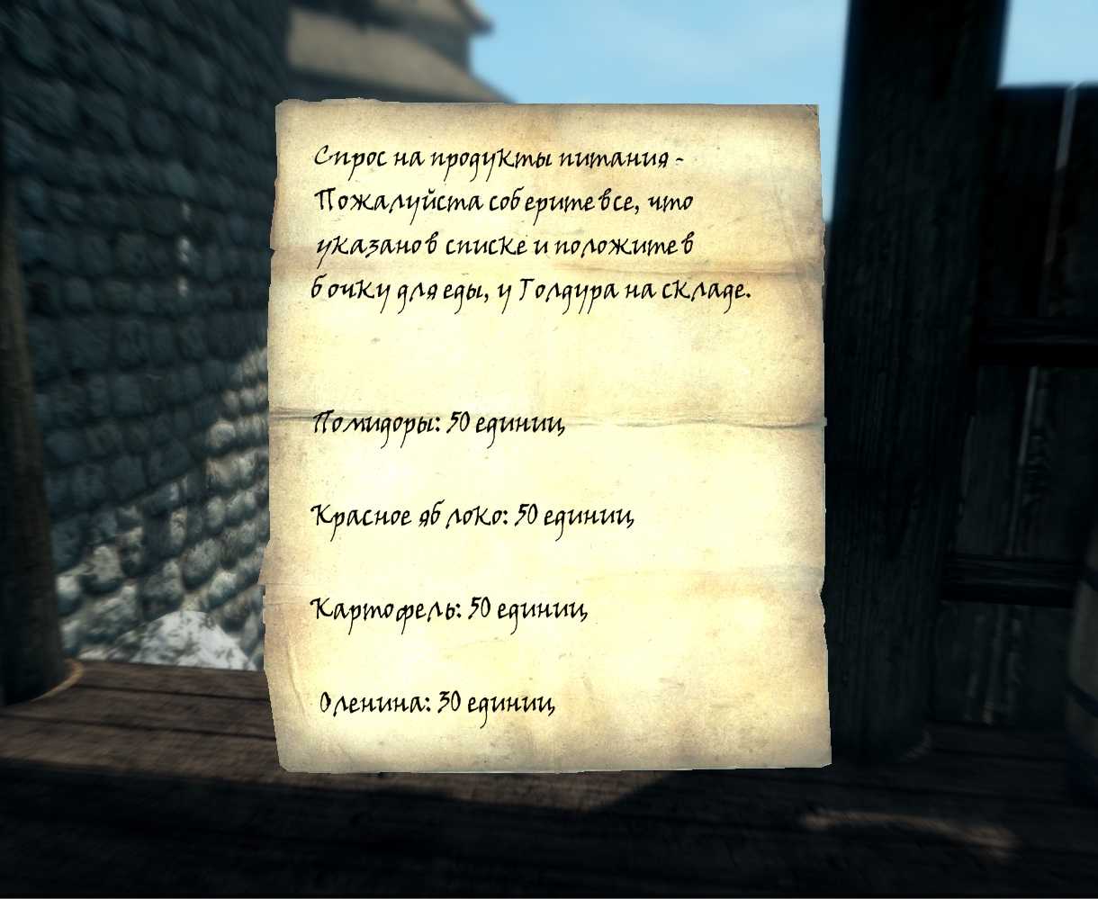 Провизию, перечисленную в списке можно купить у торговцев в Скайриме или собрать на окрестных фермах и лесах. Если вам лень заниматься всем этим, то вот вам коды на необходимые продукты. (нужно ввести консольную команду Player. additem z x, где Z — это нужный код предмета, а X количество предмета).