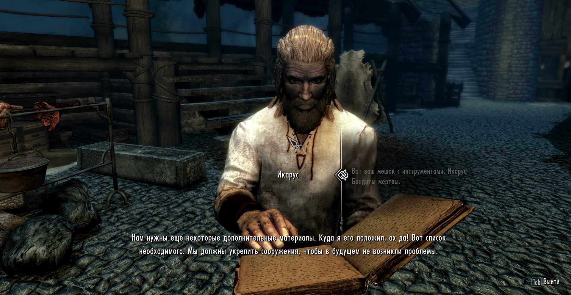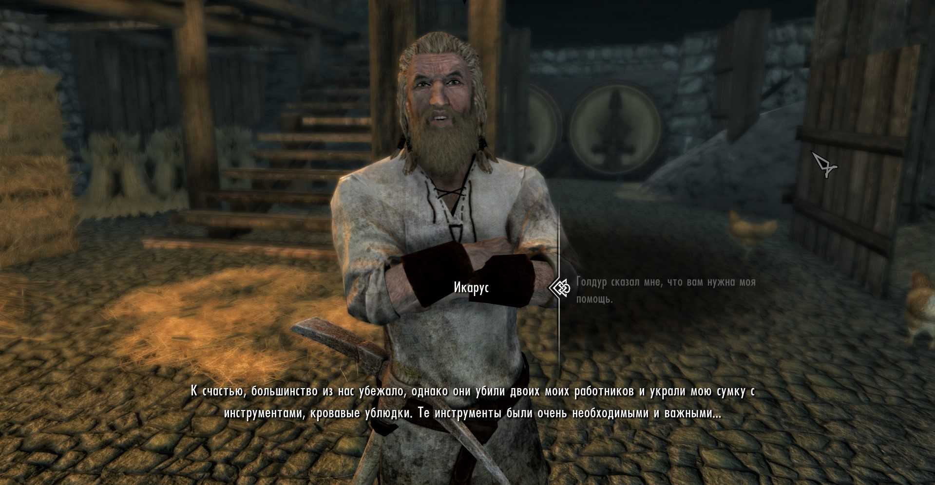 После завершения сбора, нужной провизии, погрузите ее в бочку для провизии и поговорите с Голдуром. Голдур поблагодарит вас за помощь и отправит на помощь к Икарусу. Икарус сообщит вам, что для ремонта замка ему нужны инструменты, которые у него украла шайка бандитов. Отправляемся карать шайку попутно, возвращая инструменты нашего строителя. После чего возвращаемся к нему.