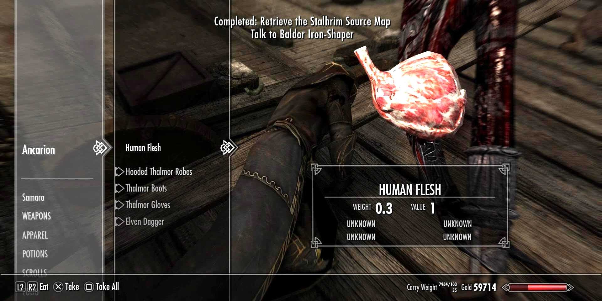 Если оставить в стороне даэдрический квест «Вкус смерти», где Драконорожденный получает буквальную возможность официально стать каннибалом и быть принятым в культ, игрок все равно может предаться немного «легкому» каннибализму, если пожелает (не вступая в культ). Как бы странно это ни звучало, у Драконорожденного есть возможность съесть множество различных ингредиентов, найденных во время путешествия, причем некоторые из них менее вкусны, чем другие. Сорвать цветок и съесть его, чтобы увидеть его эффект, — это одно, но вытащить кусок человеческой плоти или человеческое сердце, чтобы откусить от него кусочек посреди рынка, — это уже перебор. Однако, похоже, никто не будет беспокоиться или задавать вопросы, если игрок решит сделать перерыв на перекус и полакомиться человеческим мясом.
