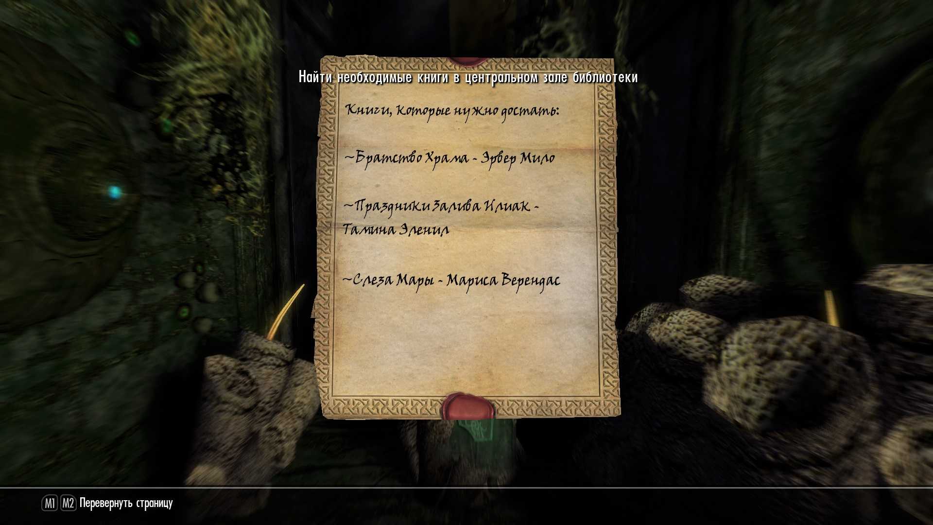 После того, как вы собрали все книги, Шанат отправит нас обратно в город раздать все книги нужным адресатам. Но на выходе нас встретит Йен Илу — давний коллега Шаната. Диалог с ним прервется возгласом сирен двемерской сигнализации, которую пробудили неосторожные действия Шаната. Вам предстоит тяжелый бой, по завершению которого Йен Илу попросит найти в библиотеке некий фолиант и двемерские чертежи, отправляемся к закрытой двери двемерской библиотеки. В библиотеке нам встретится еще один чистильщик, советую убить его и забрать его этериевое ядро. Этериевые ядра пригодятся нам в дальнейших квестах.