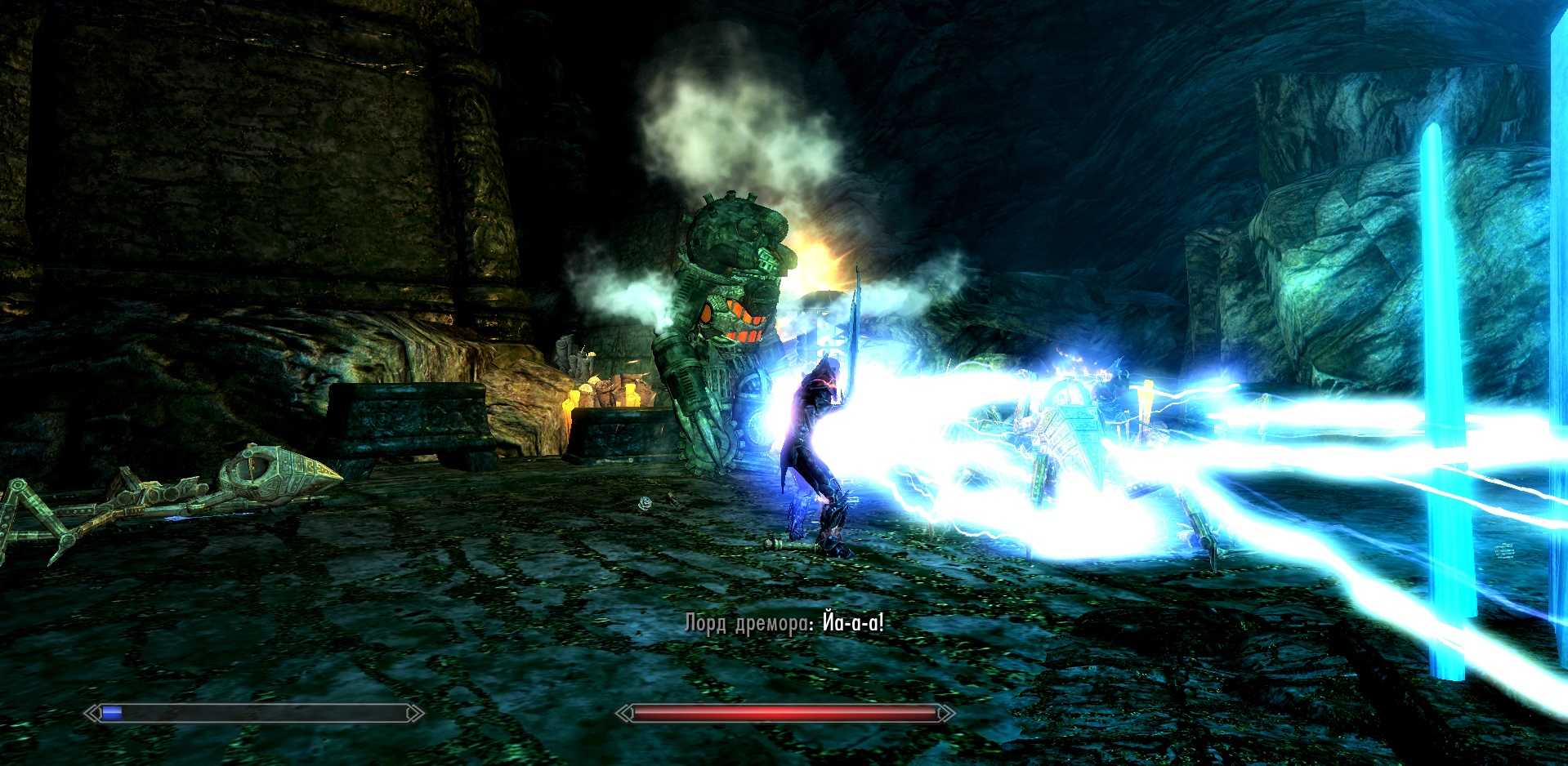 Проходите дальше и дальше, пока в итоге не выйдете в большую комнату, в центре которой будет полукруг, с текстом на языке драконов. Подойдя к этой стене — вы прочитаете один отрывок. В это время, из одной могилы за вашей спиной выйдет Повелитель Драугров — вам предстоит тяжелый бой. Справившись с ним, возьмите с его трупа Драконий камень, теперь найдите проход к выходу (не нужно возвращаться, впереди найдете второй выход из подземелья).