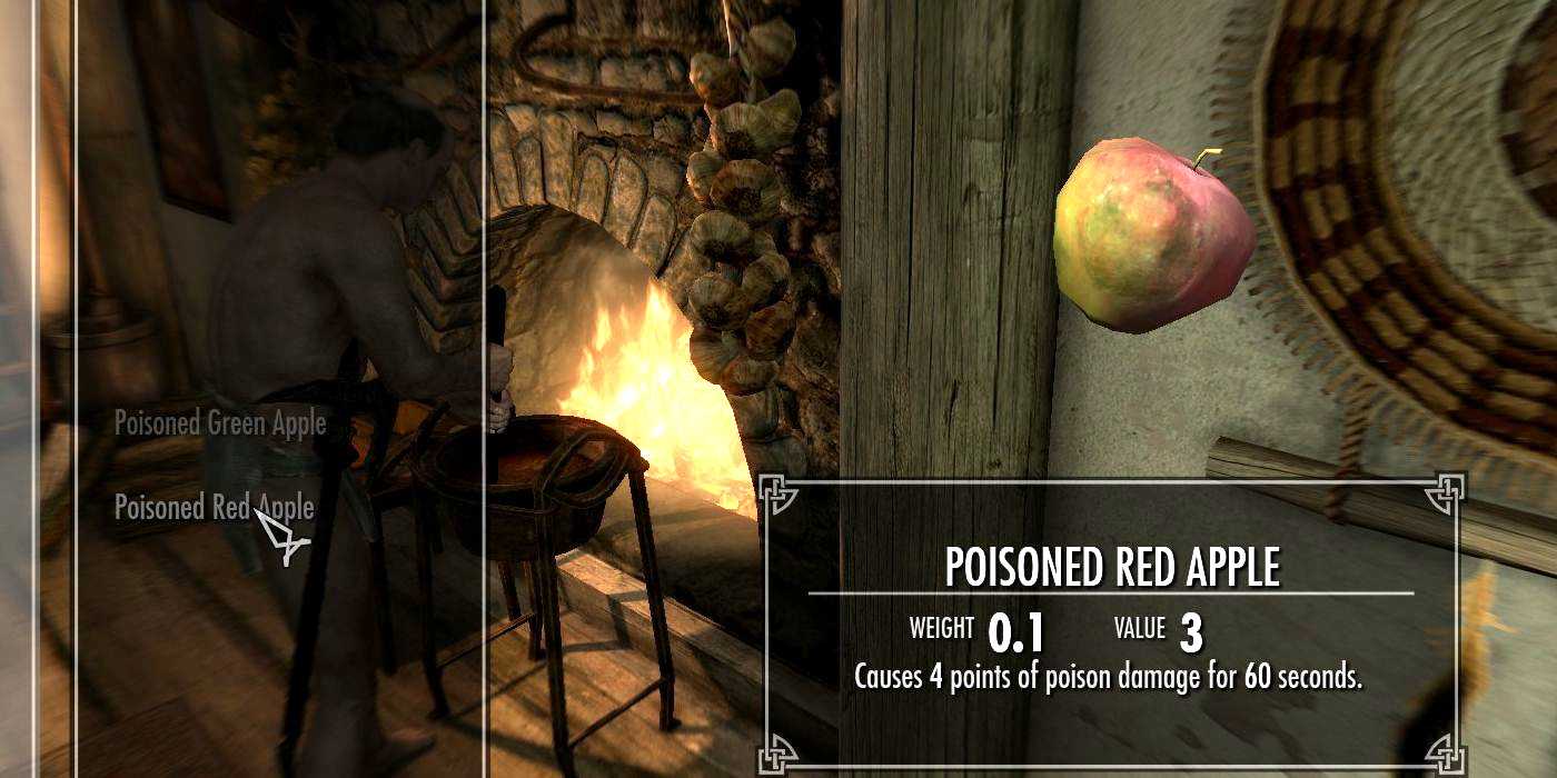 Мод Rare Curios добавляет ряд ингредиентов и предметов из других Elder Scrolls игры. Oblivionотравленные яблоки печально известны, отчасти благодаря братьям ЛаФейв, которые пародировали нелепый способ, которым жертвы умирают, съев их. Наконец, благодаря редким диковинкам, отравленные яблоки попадают в Skyrim. Есть две разновидности, в которых используются либо красные, либо зеленые яблоки. И отравленное красное яблоко, и отравленное зеленое яблоко наносят 4 урона ядом в секунду в течение целой минуты в общей сложности 240 единиц урона. Однако их нельзя купить у NPC, их нужно изготовить. Соедините красное или зеленое яблоко с душицей (включается при создании Редкого курьеза) в варочном котле, чтобы создать это любимое лакомство мастеров-убийц Киродиила.