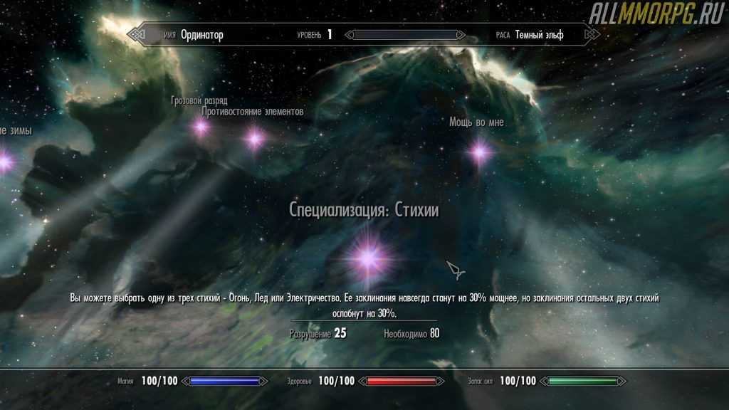- Разрушение. Прокачка навыка основывается на нанесении урона заклинаниями школы «Разрушение»;