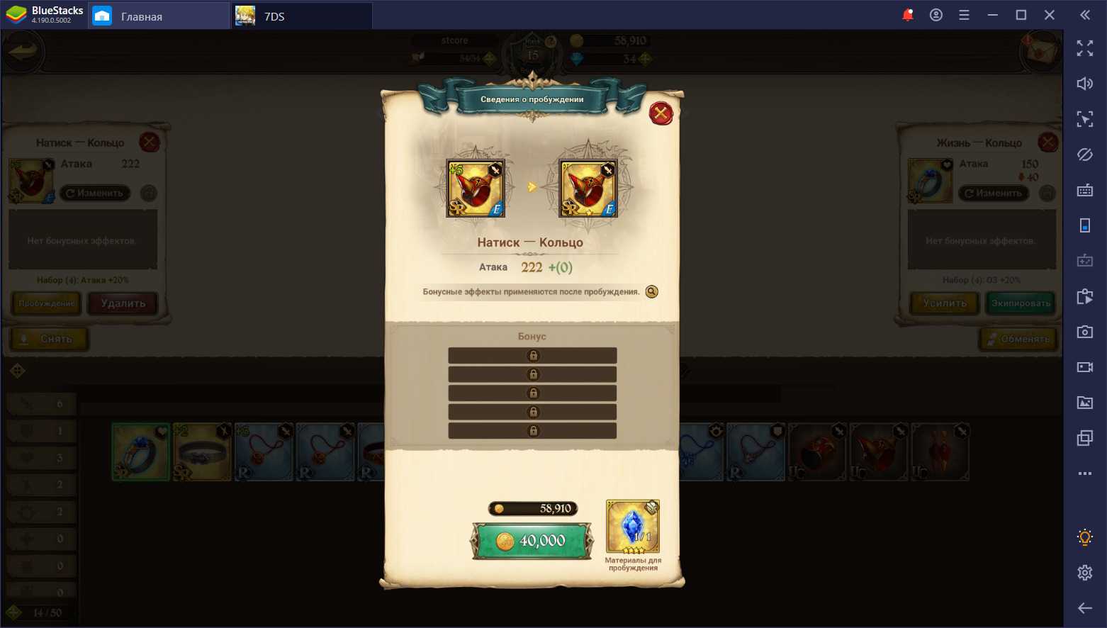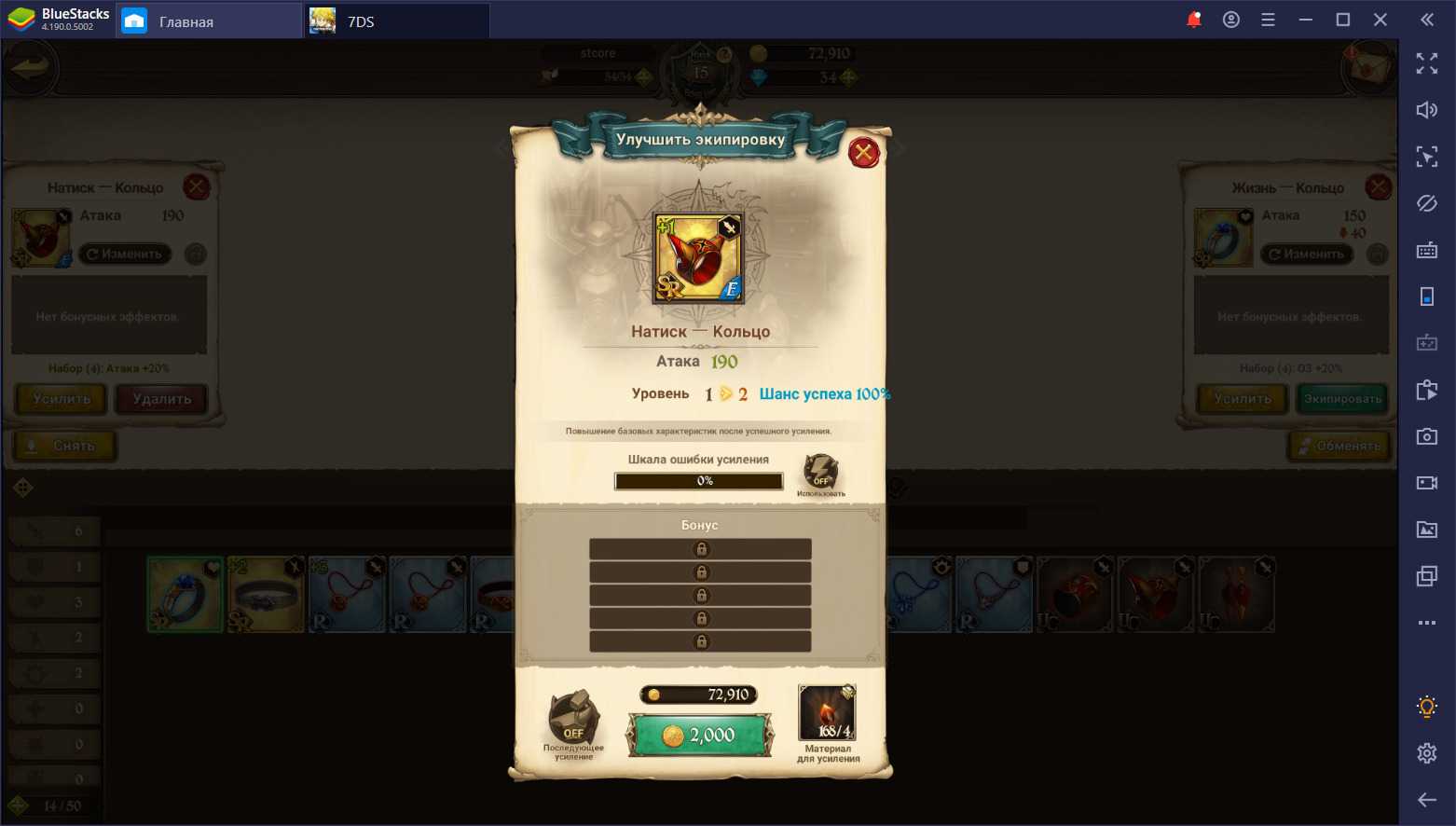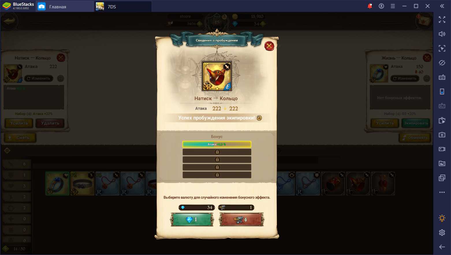 Как только вы наберете достаточное количество камней усиления, переходите к процессу прокачки. В данном случае мы повышаем характеристики кольца из набора атаки.
