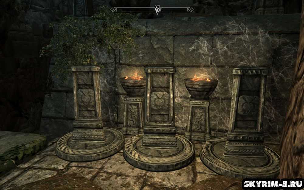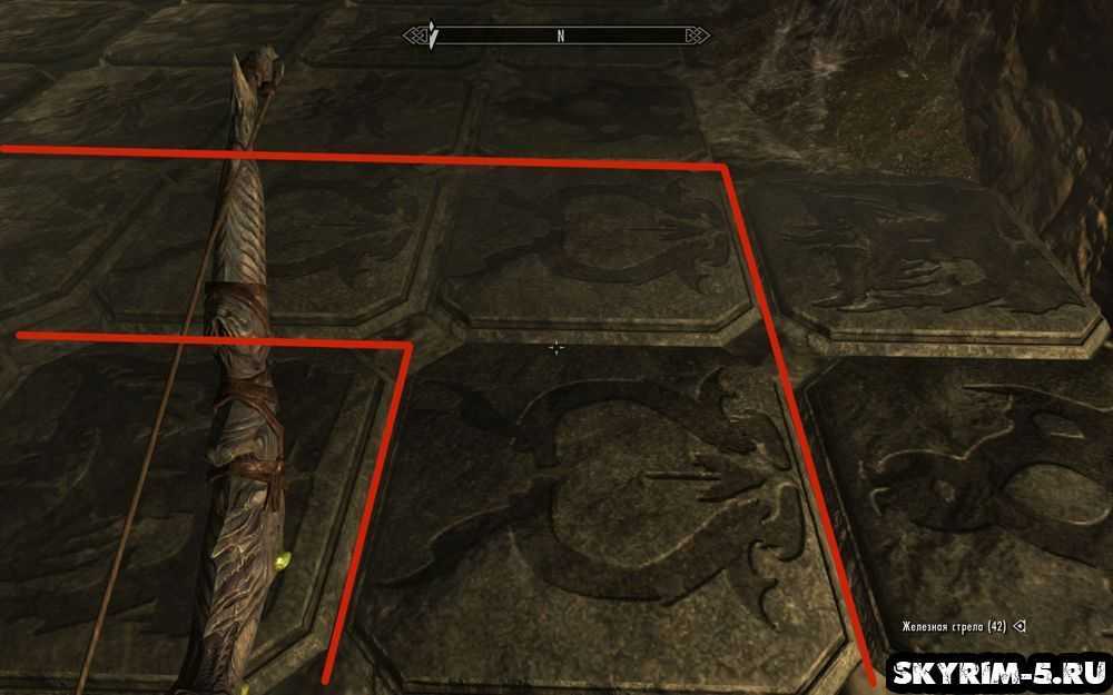 Комната, с огненной ловушкой (жарит очень больно), и плитами, которые реагируют на наступание. Решение — идти только по плитам которые обозначают довакина (с.м. скриншот), дойдете до огненной установки, дерните за рычаг, и ловушка отключится.