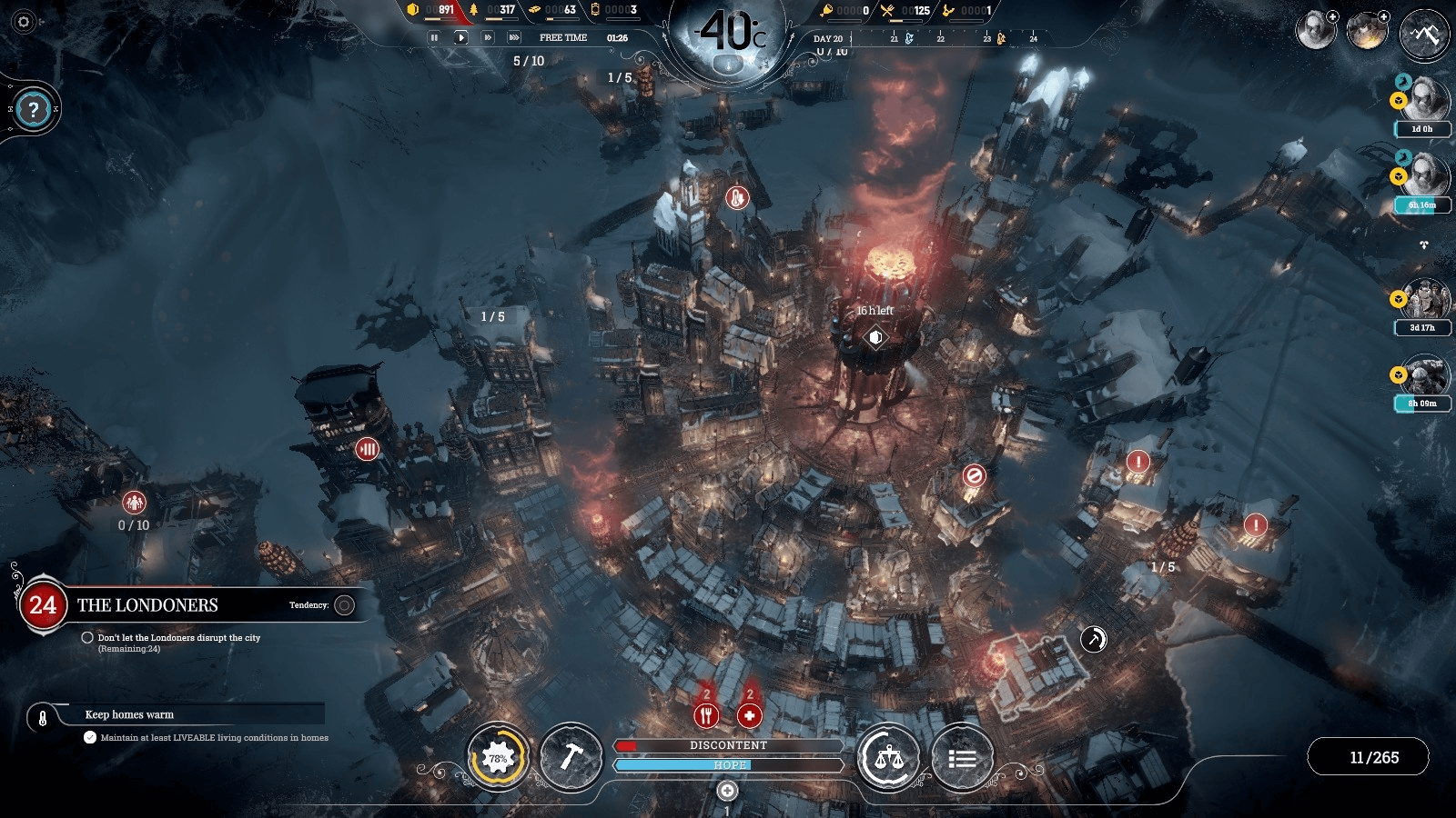 В этот момент на сцену вышли мы — игроки. Нам поставили простую задачу — обеспечить жителей города всем необходимым и сохранить им жизнь. Для этого мы строили на ограниченной области вокруг генератора здания, грамотно использовали ресурсы, принимали законы, устанавливали свои порядки, влияли на жизни простых людей, действовали порой слишком жестко ради выживания большинства.