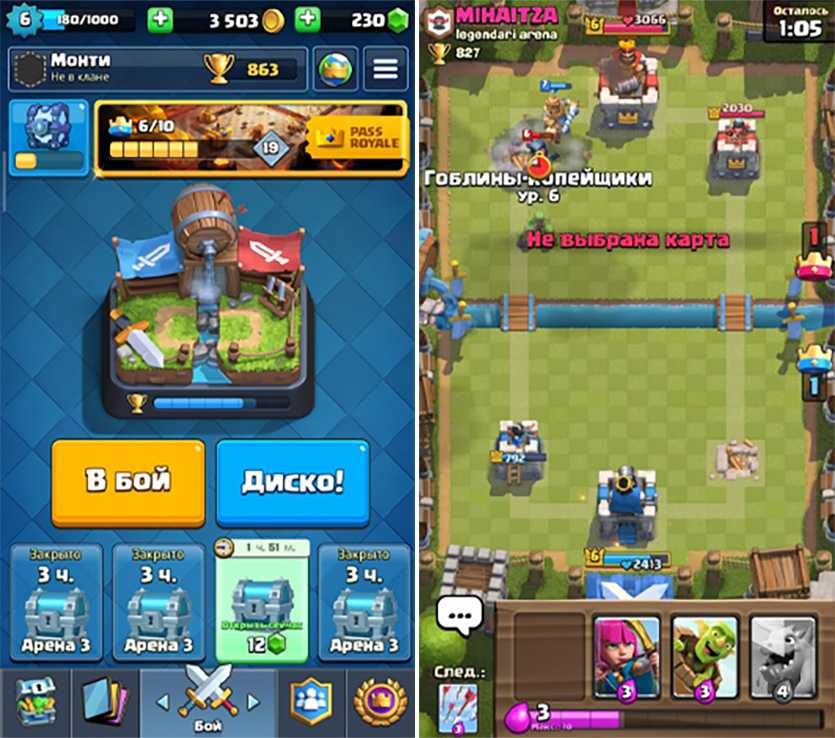 Сыгранная карта превращается в юнит или здание, либо применяется как заклинание, непосредственно наносящее урон юнитам и башням противника. Прямое управление юнитами нам недоступно – мы определяем только место и время применения карты, дальше она живет своей жизнью.
