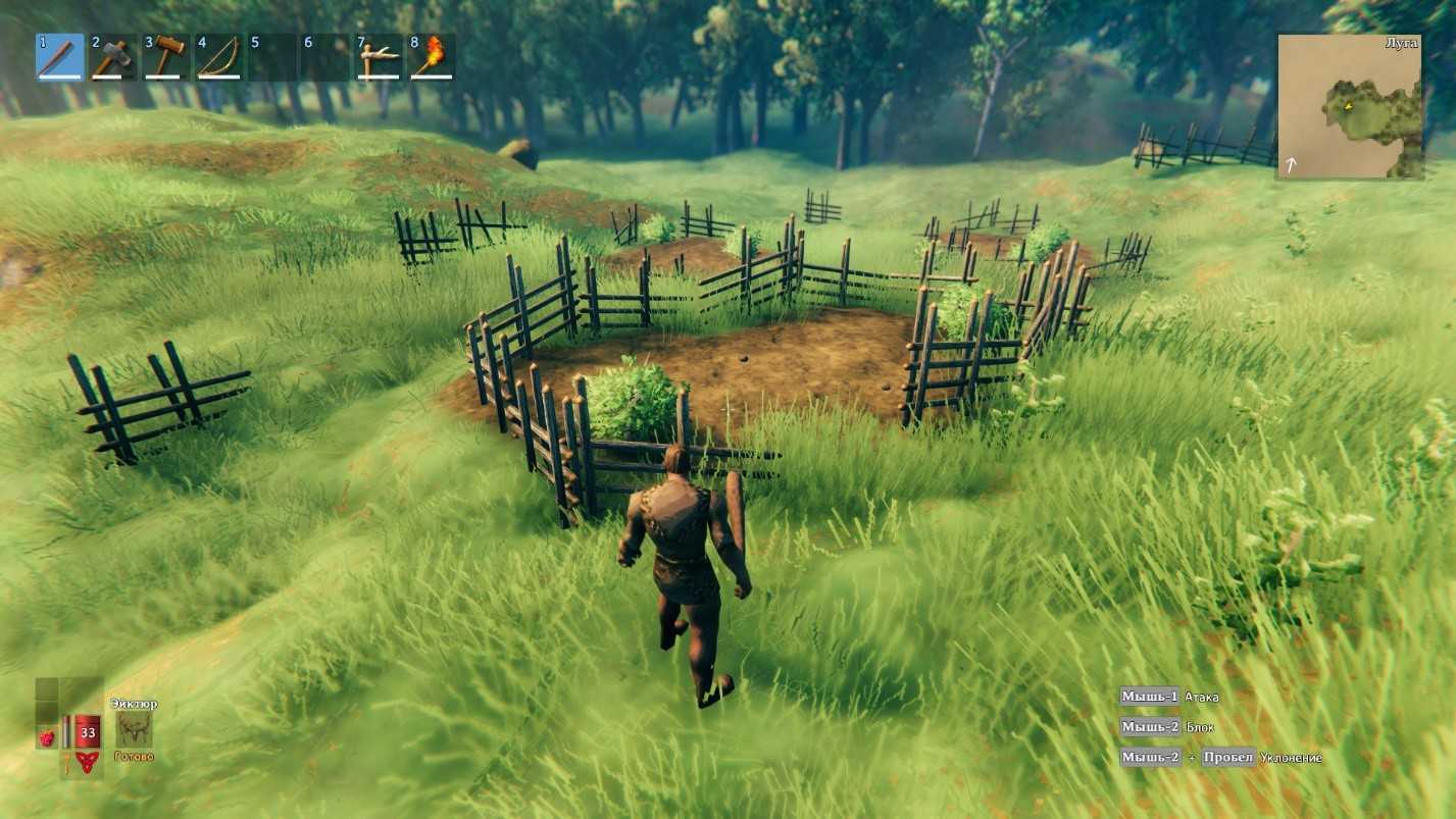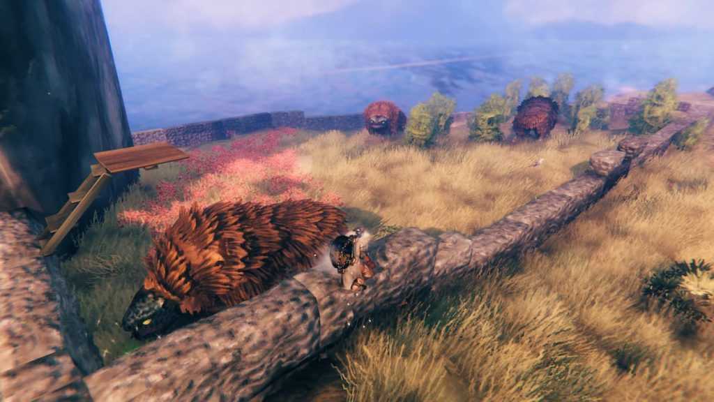 Быкоящер в Вальхейме — зверь достаточно большой и при этом не менее сильный. Чтобы сдержать такое существо, деревянного забора будет уже мало, поэтому нам необходимо сперва-наперво построить именно каменное ограждение. Также отличным дополнением загона для локсов станут железные ворота, через которые мы сможем беспрепятственно покинуть территорию, не опасаясь за возможный побег быкоящера. Как и в пункте выше, оставляем место ровно для одной каменной стены, чтобы построить её после поимки зверя. Также не стоит забывать про небольшое возвышение вроде башни, с которого можно сбрасывать еду без риска быть атакованным локсом.