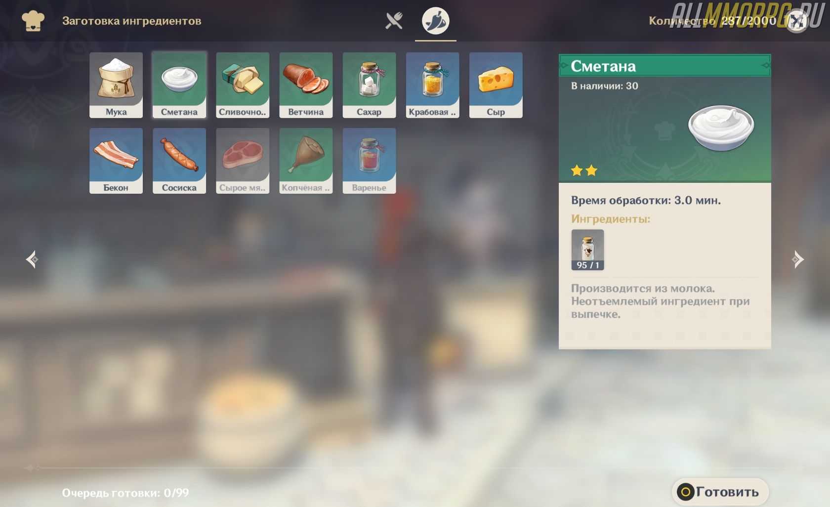 Если вам не хватает какого-то компонента для блюда, откройте вкладку «Заготовка ингредиентов» и посмотрите, можно ли его приготовить из имеющегося сырья. Например, мука готовится из пшеницы, ветчина из соли и сырого мяса, а варенье из закатника, ягод и сахара.