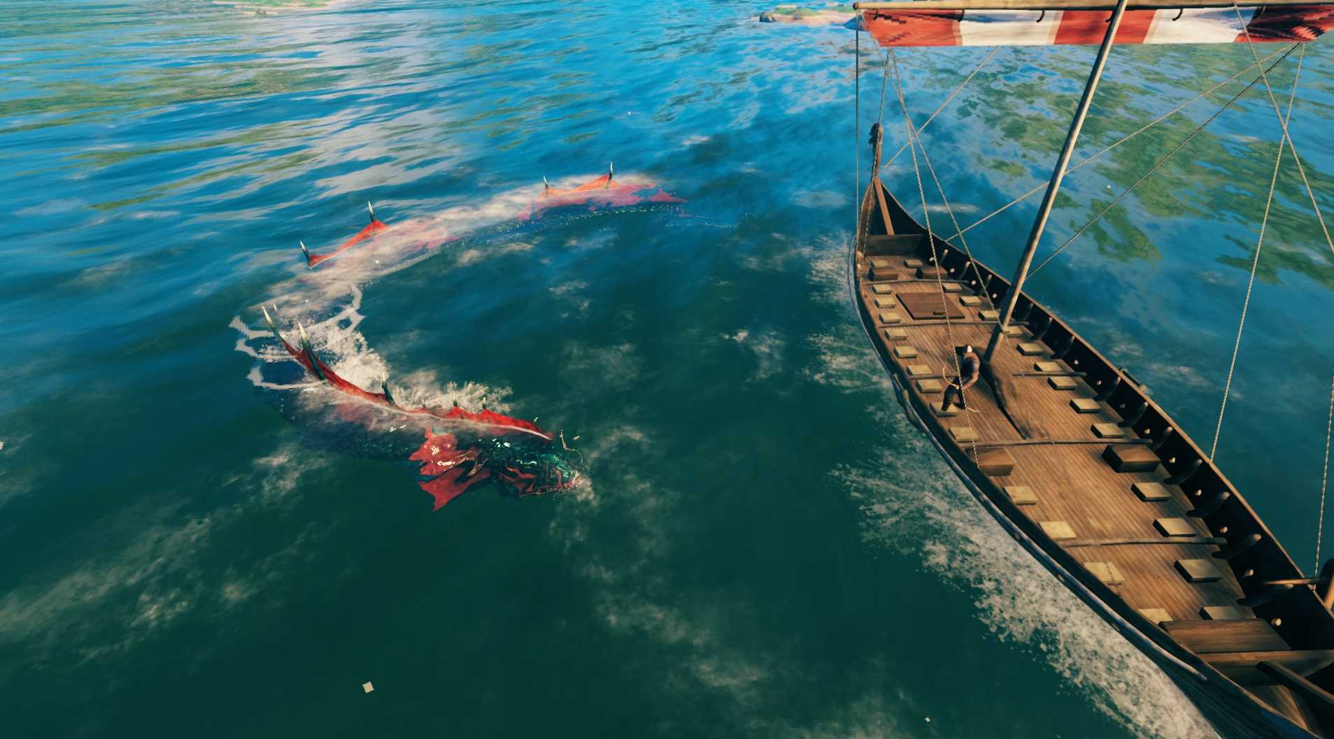 Снарядившись, отправляйтесь в путь. Как только увидите змея, цепляйте его гарпуном. После этого он будет привязан к вашему персонажу. Возвращайтесь к штурвалу и плывите на мелководье, поближе к берегу. Зачем? Дело в том, что помимо мяса из змея выпадает чешуя, которая нужна для крафта топового щита (в основном из-за чешуи на змеев и охотятся, а мясо идет бонусом). Оказавшись на мелководье, направьте лодку вдоль берега, чтобы она никуда не врезалась, отпускайте штурвал и начинайте стрелять по змею из лука. Дальше все будет зависеть от вашей ловкости и благословения богов.