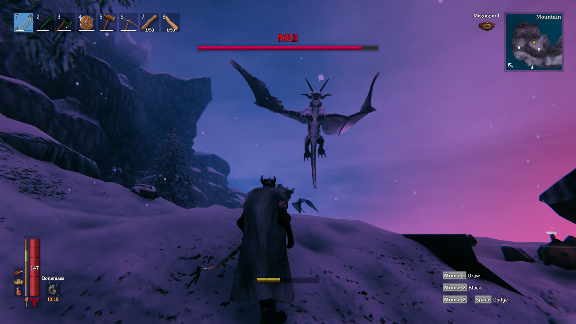 Место обитания четвертого босса Valheim – биом Горы. У Моудера целый ряд особенностей и преимуществ перед главным героем – дракон не только может перемещаться по воздуху и обладает огромным запасом здоровья, но и способен нанести существенный урон. Вот почему главному герою нужно иметь повышенный ХП, включая выносливость, чтобы уклоняться от атак летающего монстра. Чтобы одолеть его – нужно подкрепиться мясом быкоящера.