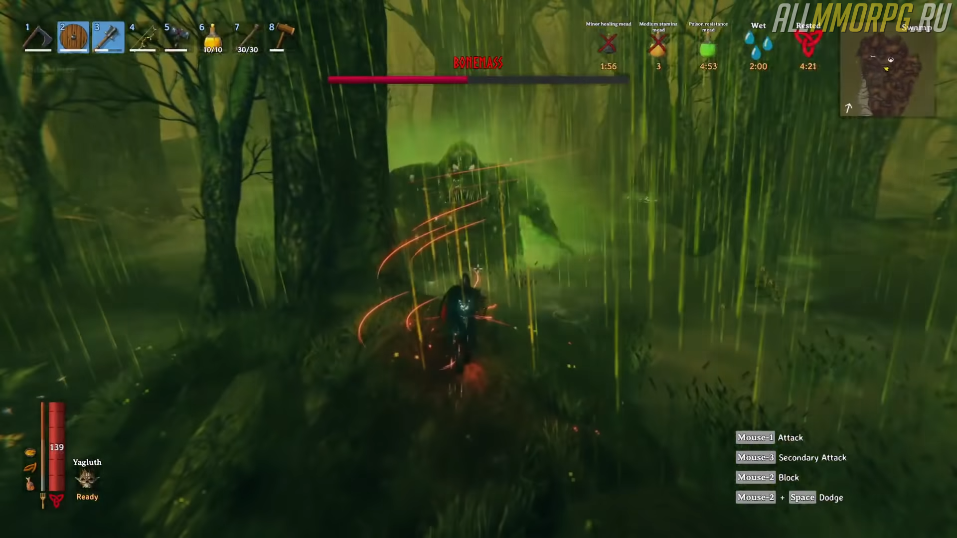 Масса Костей – сильный противник и к встрече с ним нужно тщательно подготовиться. Особенностью этого босса стали атаки, наносящие урон от яда, поэтому первым делом положите в свой инвентарь мед, повышающий сопротивление ядовитым веществам
