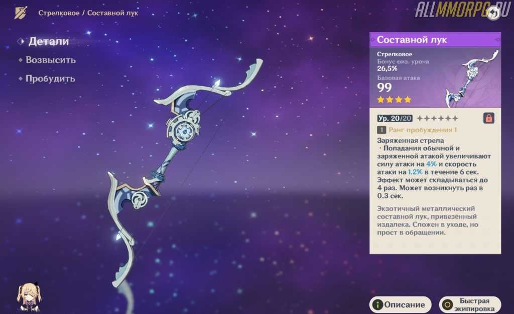 Чтобы выжать максимум дамага при стрельбе Составного лука, мы рекомендуем прокачать Фишль созвездие до 6 уровня. С ним спутник героя (ворон Оз) будет наносить больше урона, пока присутствует на поле боя. В том случае, если вы не любите играть за Фишль, экипируйте Составным луком Венти. Он тоже получит пользу от способности повышения скорости атаки за счет нанесения урона обычными/заряженными попаданиями из этого оружия.