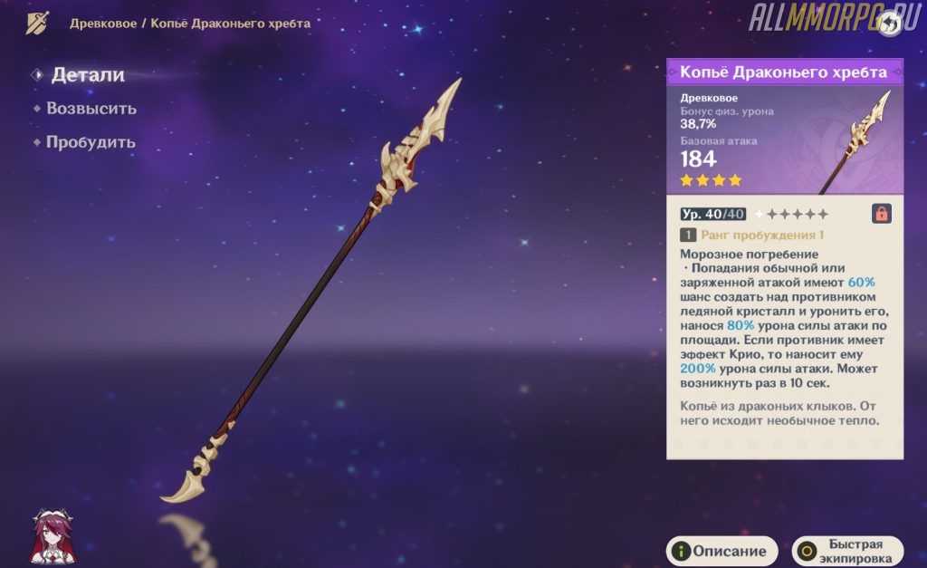 Копье Драконьего хребта имеет такие же свойства, как и Заснеженное звездное серебро. Оно прекрасно подходит для Розарии, так как этот герой способен накладывать на противников эффект Крио. Помимо этого, оружие можно надеть на Сяо и Ху Тао. И хотя для них рекомендовано копье Смертельный бой, Копье Драконьего хребта на время сможет его заменить.