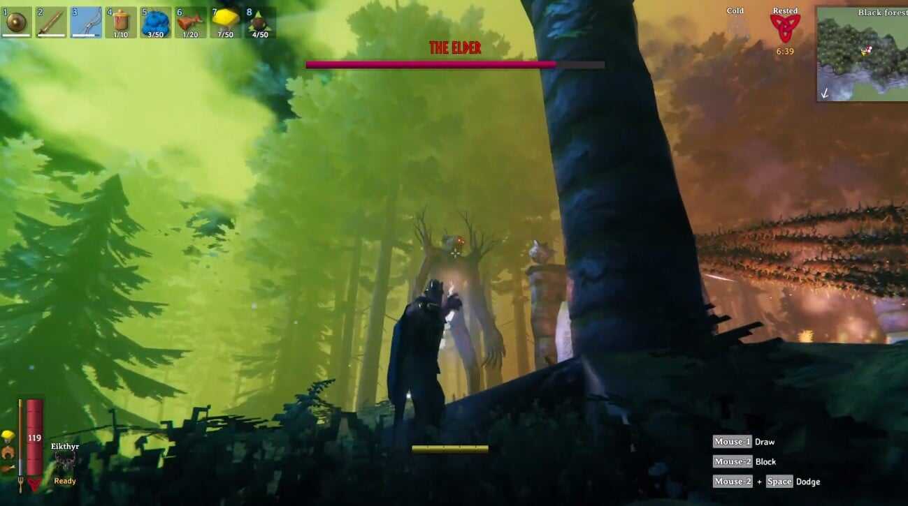 Если хотите победить противника, не получив урона, то советуем вам держаться от него подальше, стоя неподалеку от больших камней. Так вы сможете наносить ему урон из лука (подойдут и начальные варианты) и при этом уклоняться от его дальних атак. Советуем использовать огненные стрелы, чтобы поджечь Древнего.