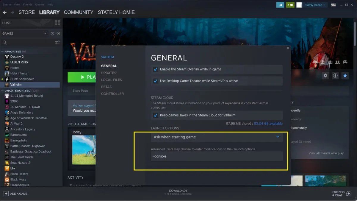 - Steam — щелкните правой кнопкой мыши Valheim в своей библиотеке и выберите свойства. На вкладке «Общие» выберите параметры запуска и введите « -console ». Закройте и запустите игру.