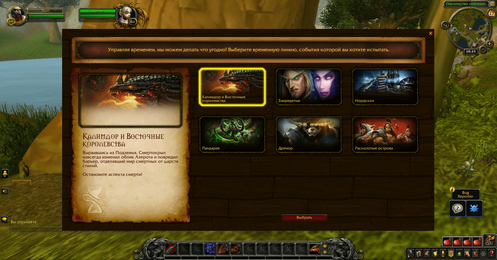 Тем, у кого уже есть прокаченный персонаж, вводится новая система возвращения во времени. Спасибо большое Хроми. Благодаря ей, при старте за нового персонажа, вы сможете выбрать любое удобное для себя дополнение. Будь то приятный глазу Легион, цветистая Пандария и даже Запределье.