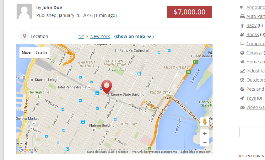 - Location Format – select how you would like to have the location displayed once user will fill the form (notice bold “New York, NY” on the right side of the first image). This will apply only to the form, on Ad details page location will display as a taxonomy path.