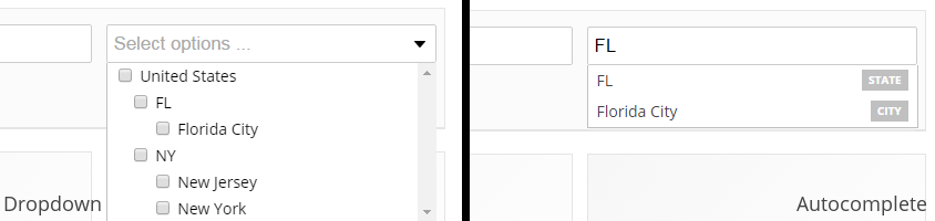Left side: entering a location using drop-down. Right side: entering a location using autocomplete input.
