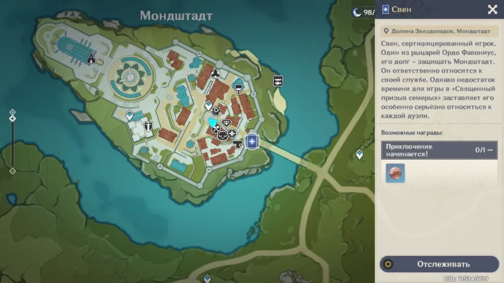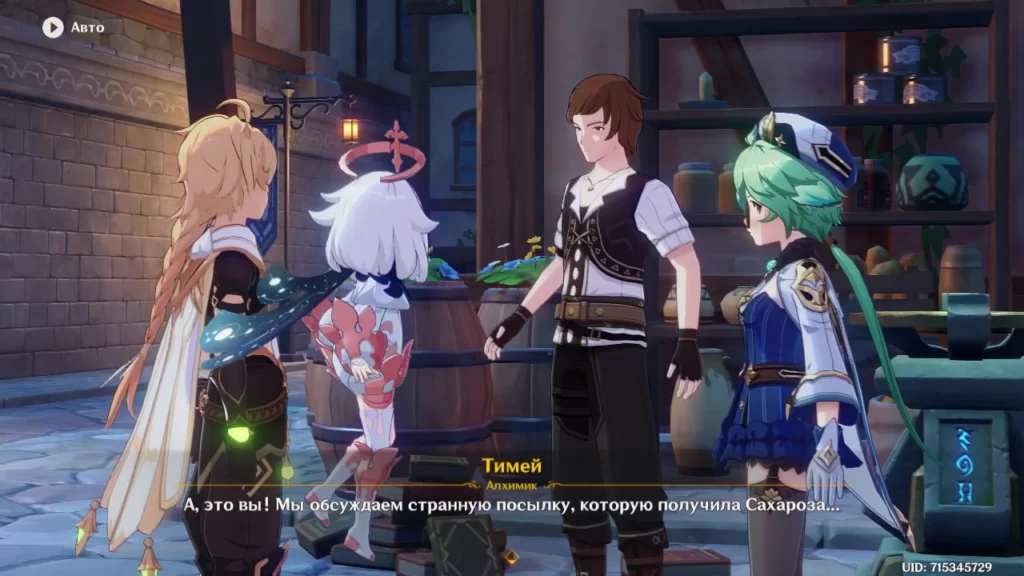 Отправляемся в Мондштадт, чтобы поговорить с алхимиком Тимеем. Он как раз обсуждает странную посылку с Сахарозой. Ей в знак благодарности прислали из Сумеру коробку с картами.