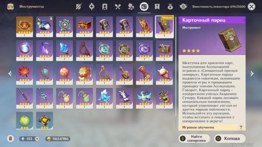 Карточный ларец — новый инструмент, который можно найти на соответствующей вкладке в инвентаре. С его помощью можно настраивать и выбирать колоды, а также подыскивать ближайших противников, которым можно бросить вызов.