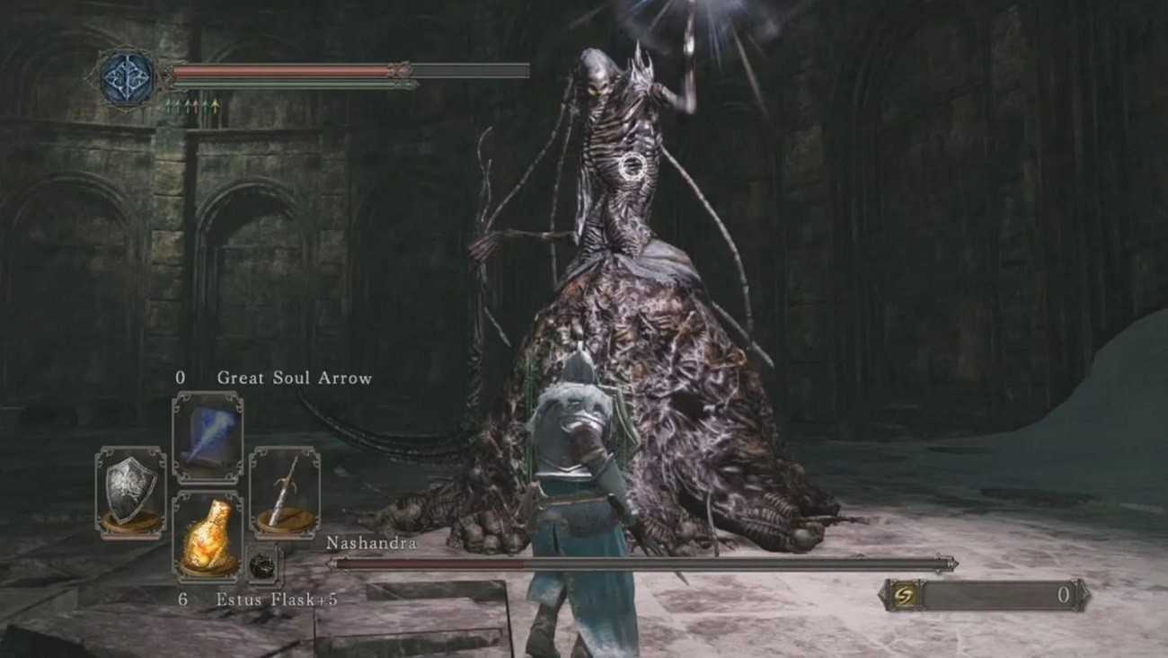 По возможности лучше не вступать в ближний бой и не пользоваться блоком, так как проку от него здесь мало. Предпочтительнее атаковать босса с расстояния при помощи стрел и маги. Увернуться от встречных ударов в целом несложно. А еще помните, что Нашандра уязвима к молниям.