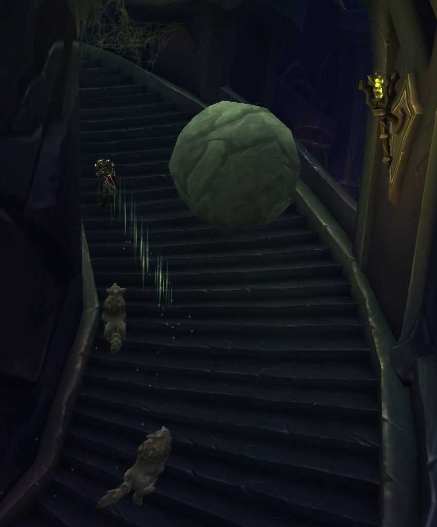 игроки пробегают этот пролет, используя зелья невидимости. Оббегать придется дважды — в первый раз на пути к Хмуродробу и второй раз после его убийства, когда вы спускаетесь вниз к финальному боссу.