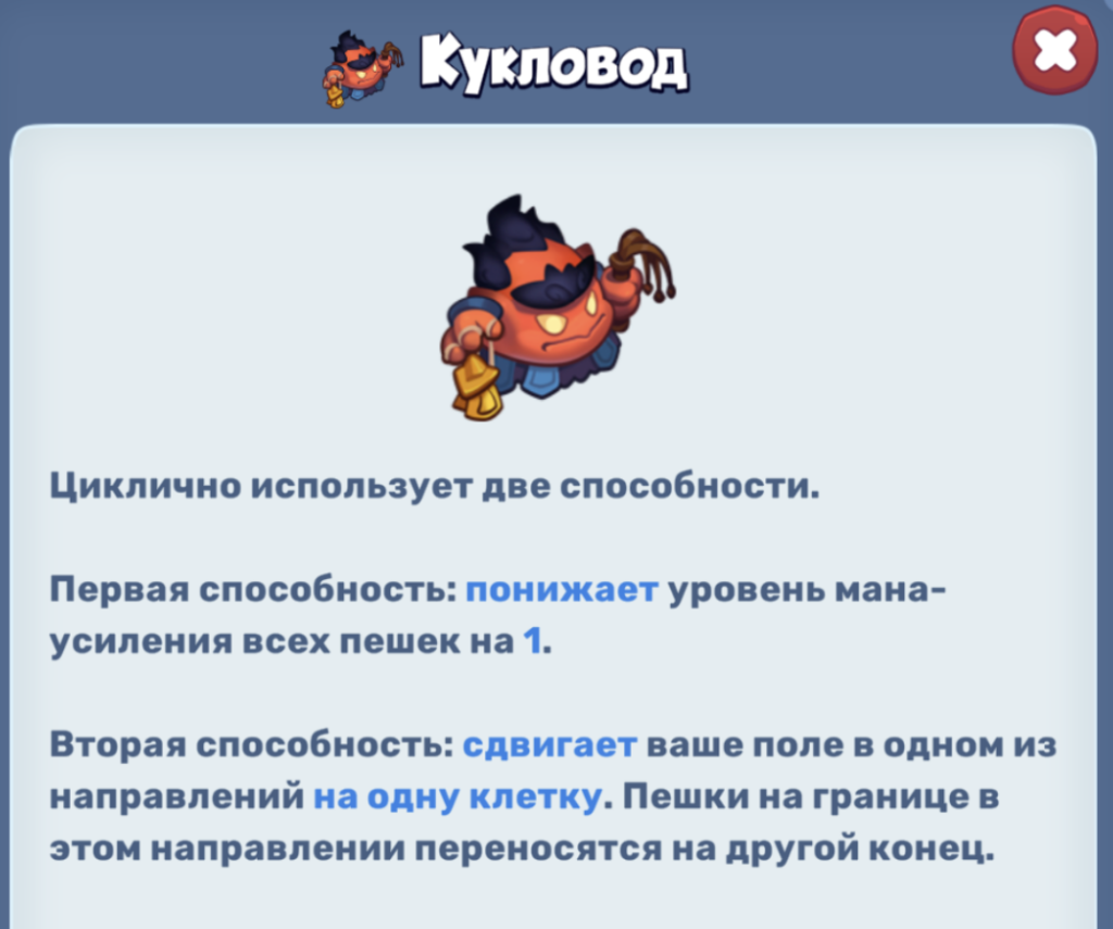 Первая способность: понижает уровень мана-усиления всех пешек на 1.