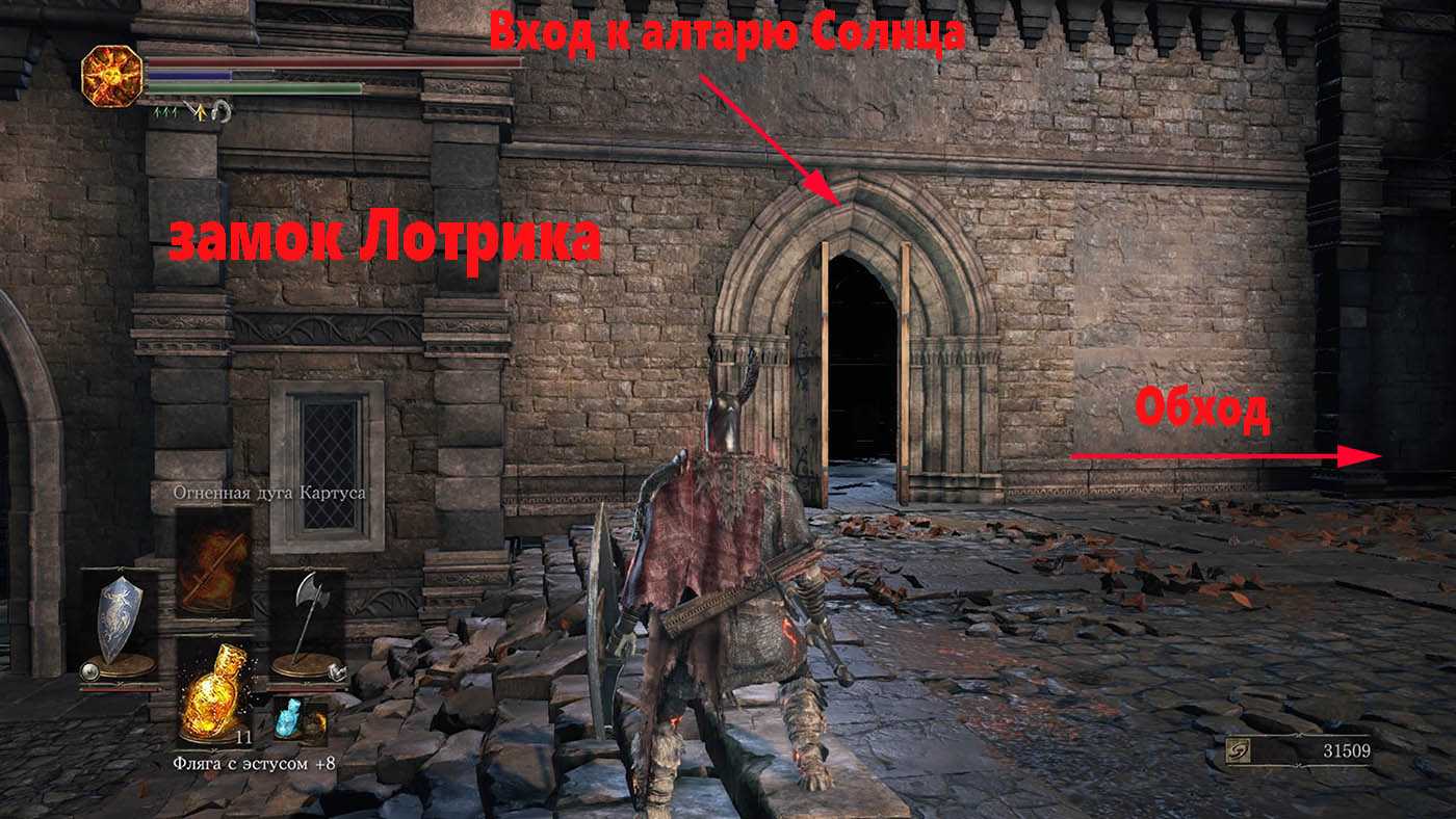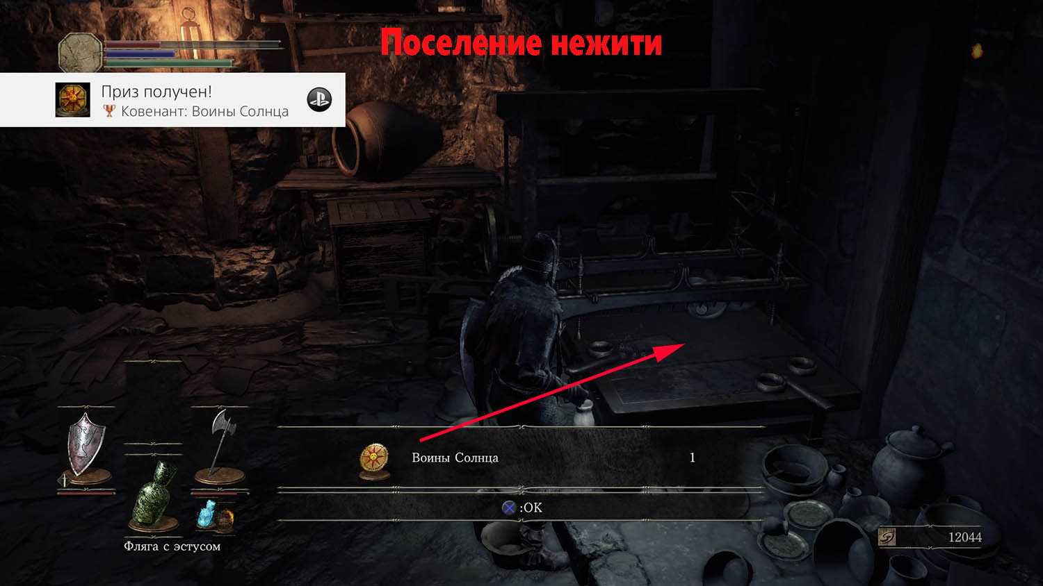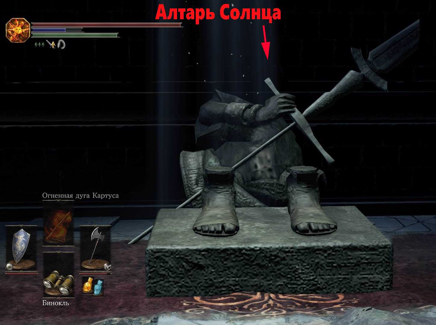 В этой локации дойдите до входа к боссу доспехи драконоборца, а затем поверните налево и пройдите в тупик мимо закрытых дверей. В этом месте имеется лестница наверх по которой заберитесь на здание и по крыше пройдите в другое помещение. Здесь спуститесь по лестнице и пройдите по длинному коридору в следующее помещение, где увидите алтарь Солнца! Поклонившись ему вы получите Теперь, при помощи , вы можете увеличивать ранг в ковенанте.
