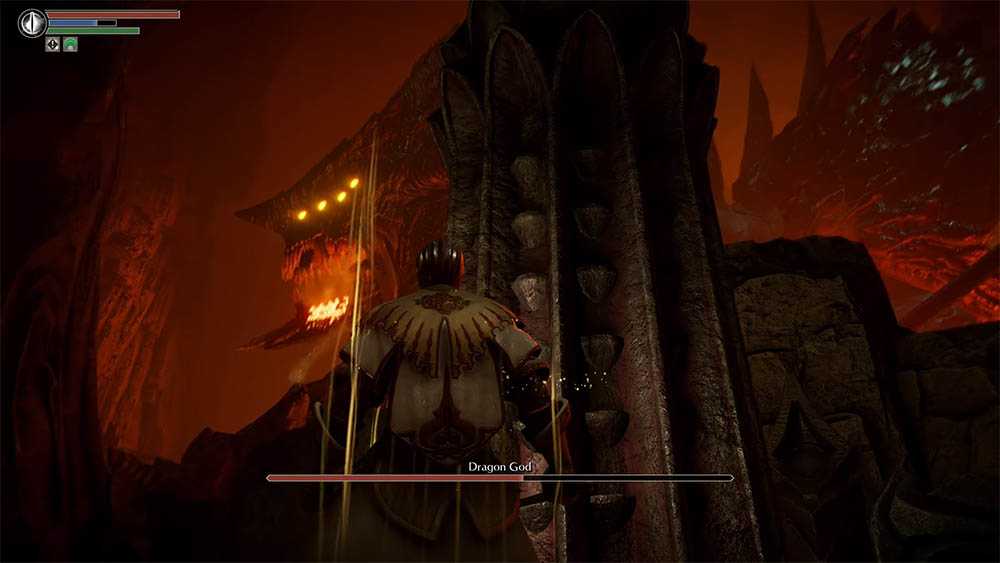 Босс Бог драконов (Dragon God) находится в локации Обелиск Огненного Соглядатая (2-3). Как только вы попадете на арену с этим боссом, идите направо, разрушая по пути завалы. Вы должны подняться по лестнице наверх и выстрелить в босса из баллисты. В моменты, когда босс будет атаковать, прячьтесь за стенами. После первого выстрела бегите на другую сторону арены, чтобы выстрелить в босса из второй баллисты. Когда босс упадет, спуститесь вниз и бейте его по голове